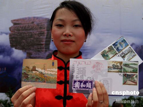 5月10日,印江郵政工作人員展示《頤和園》郵票。當(dāng)天,《頤和園》特種郵票一套6枚和1枚小型張?jiān)谫F州印江首發(fā), 印江土家族苗族自治縣舉辦了慶!额U和園》特種郵票發(fā)行活動(dòng)。《頤和園》郵票內(nèi)容是十七孔橋、長(zhǎng)廊、石舫、諧趣園、玉帶橋、后湖,小型張是佛香閣。這套郵票是繼長(zhǎng)城、故宮、天壇后發(fā)行的又一套北京名勝題材郵票!额U和園》三個(gè)字,是清代書(shū)法家、貴州印江的嚴(yán)寅亮所書(shū)。中新社發(fā) 陳曉嵐 攝