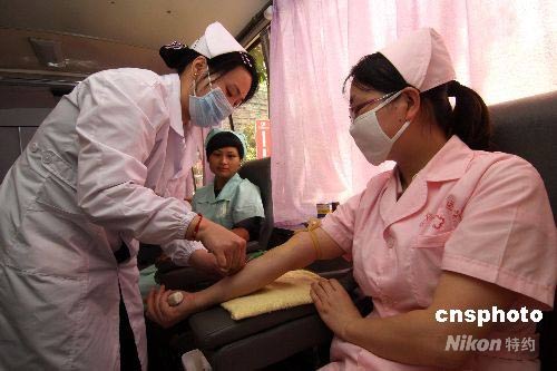 5月11日,湖南婁底市眼科醫(yī)院的護(hù)士在獻(xiàn)血!5.12”國際護(hù)士節(jié),婁底市眼科醫(yī)院、婁底口腔醫(yī)院、東方醫(yī)院的100多位護(hù)士,在節(jié)日前無償獻(xiàn)血。中新社發(fā) 郭國權(quán) 攝