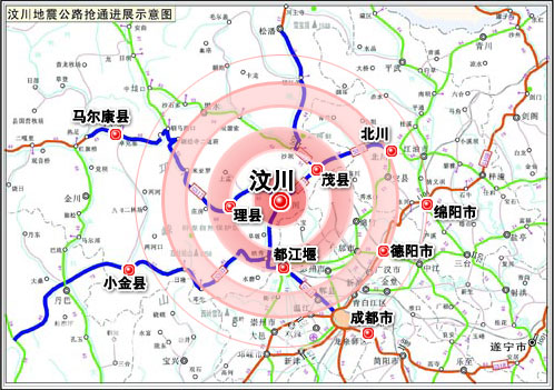 據(jù)來自交通運輸部的消息,目前,四川省內(nèi)所有高速公路均已恢復(fù)正常通行,成都、德陽、綿陽、雅安等受災(zāi)地區(qū)的主要干線公路也已搶通。但都江堰至汶川、理縣至汶川、茂縣至汶川、臥龍和映秀至汶川的公路損毀極為嚴(yán)重,交通部門正同時從東西南北四個方向全力搶通前往汶川的受損公路。