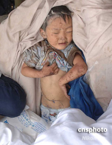 5月14日,四川省北川縣一名從廢墟中救出的兒童被安置在臨時(shí)搭建的醫(yī)療點(diǎn)內(nèi),接受簡(jiǎn)單治療后被送往臨近的大城市。北川縣是“5.12”四川大地震中受災(zāi)最嚴(yán)重的地區(qū)之一。中新社發(fā) 鄒憲 攝
