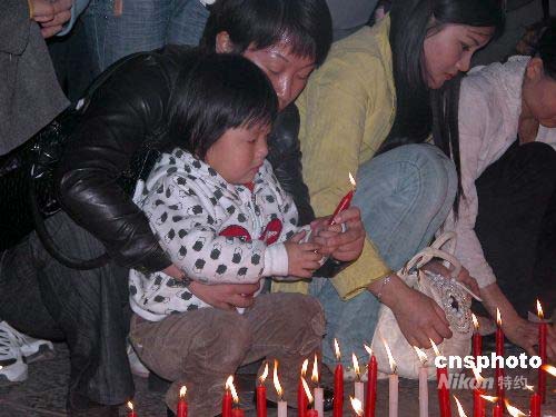 五月十四日晚,昆明市數(shù)百群眾自發(fā)來到市中心的東風廣場,點燃蠟燭,為災區(qū)群眾祈禱。圖為一位小女孩在家長的幫助下點燃蠟燭為災區(qū)祈福。中新社發(fā) 史廣林 攝