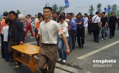 5月15日上午,此次大地震雖然給綿陽市造成了不小的災害,但綿陽市志愿者們仍然為救助在綿陽市九州體育館的災民送來物資和食物。中新社發(fā) 霍潺 攝