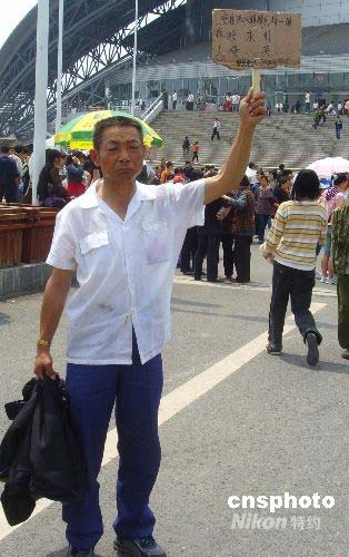 5月15日上午,來自受地震災(zāi)害較為嚴(yán)重的四川綿陽安縣沸水鎮(zhèn)的一名男子來到綿陽市抗震救災(zāi)最大的救助點(diǎn)——九州體育館外舉牌尋找親人。中新社發(fā) 霍潺 攝
