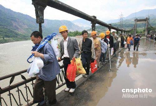 5月14日,四川岷江大峽谷紫平鋪水庫附近,來自汶川地震震中映秀、臥龍鎮(zhèn)大批災(zāi)后余生的災(zāi)民沿岷江峽谷脫離災(zāi)區(qū)。由于213國道數(shù)十處嚴重塌方,從都江堰到映秀、汶川的唯一道路被堵塞難以疏通,對災(zāi)區(qū)物資救援較為艱難。這些災(zāi)民依靠堅韌的意志沿江邊和塌方帶用近八九個小時的艱苦步行脫離災(zāi)區(qū)進入都江堰市區(qū),受到都江堰郊區(qū)農(nóng)民的歡迎和照顧,一些沿途居民特設(shè)免費茶水給他們解渴。中新社發(fā) 周青先 攝