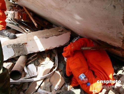 十五日十四時,福州消防支隊赴川抗震救災官兵在青川縣賓和路一家主建筑已全部坍塌的大型汽車維修廠,用生命探測儀成功解救出一名被困女工。當時,在接群眾求助后,救援隊立即趕赴現(xiàn)場,搜索分隊首先用生命探測儀確定了女工被困的大概方位,救援分隊迅速啟動救生氣墊,并用鐵鍬和雙手以土工的方式為被困女工打開了一條生命通道,半個小時后,被困女工被成功救出。中新社發(fā) 朱曉航 攝