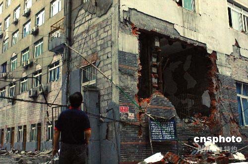 2008年5月15日,在地震災(zāi)區(qū)四川都江堰市,危樓排險工作在進行中。汶川7.8級地震,給都江堰市帶來巨大破壞,市區(qū)大批居民樓成危樓。目前危樓的居民疏散安置工作已初步展開,取得階段性成果。中新社發(fā) 鄒憲 攝