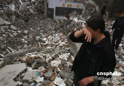 五月十七日,一位哭腫雙眼的母親徘徊在汶川大地震中垮塌的灌縣聚源中學廢墟上,在她失蹤的十四歲兒子上課位置尋找課本書包沒有結(jié)果,淚流不停。中新社發(fā) 賈國榮 攝