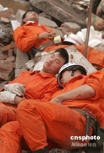 5月17日,在四川省什邡市鎣華鎮(zhèn)、紅白鎮(zhèn)等搶險(xiǎn)現(xiàn)場,連續(xù)作戰(zhàn)的洛陽消防搶險(xiǎn)救援突擊隊(duì)隊(duì)員們躺在瓦礫上小憩片刻。在四川地震災(zāi)區(qū),解放軍、武警、公安、邊防、消防官兵以及民兵、醫(yī)療救護(hù)人員和志愿者們,不怕危險(xiǎn),不畏疲勞,為搶救每一條寶貴的生命連續(xù)奮戰(zhàn)。他們是最可愛的人!中新社發(fā) 張曉理 攝
