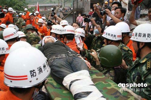 5月17日晚18時30分,在地震重災(zāi)區(qū)四川什邡市鎣華鎮(zhèn),鄭州消防支隊所在的河南總隊抗震救災(zāi)突擊隊第一梯隊成功營救一名被廢墟埋壓124小時的婦女。中新社發(fā) 申治民 攝