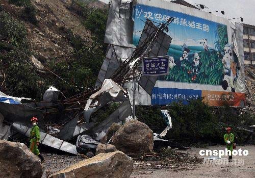 兩名武警搜救隊(duì)員5月17日在映秀鎮(zhèn)通往臥龍的303公路上巡查。5月12日發(fā)生的四川汶川大地震,將映秀鎮(zhèn)通往中國(guó)國(guó)寶大熊貓最主要保護(hù)區(qū)臥龍的303公路幾乎徹底摧毀。有專家稱,這條公路短期內(nèi)無法修復(fù)。中新社發(fā) 任晨鳴 攝