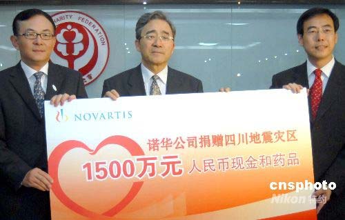 諾華中國(guó)區(qū)總裁李振福(右一)17日代表諾華公司通過(guò)中國(guó)慈善總會(huì)向四川地震災(zāi)區(qū)捐贈(zèng)一千五百萬(wàn)元人民幣的現(xiàn)金和藥品。對(duì)他中國(guó)慈善總會(huì)會(huì)長(zhǎng)張寶庫(kù)(中)稱(chēng),四川地震災(zāi)區(qū)同胞的生命安危,牽動(dòng)著我們的心。他希望諾華的捐贈(zèng)能為挽救災(zāi)區(qū)人民生命和災(zāi)后重建提供幫助。中新社發(fā) 曾利明 攝