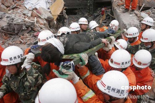 5月17日18時(shí)18分,四川省什邡市鎣華鎮(zhèn)鎣華實(shí)業(yè)有限公司31歲女工卞剛芬在震后本廠綜合大樓廢墟下被埋124小時(shí)后,經(jīng)河南消防搶險(xiǎn)救援突擊隊(duì)連續(xù)31小時(shí)的艱苦營(yíng)救后奇跡生還,她意識(shí)清醒,對(duì)周?chē)娜藗冋f(shuō)著“感謝”。中新社發(fā) 張曉理 攝