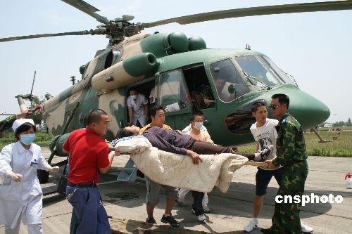 5月18日中午1時許,首批來自四川北川縣重災區(qū)的20名受重傷群眾,被總參某陸航團4架直升機運到空軍駐彭山機場,立即被送到眉山市各主要醫(yī)療單位救治。從當天起,一大批來自北川邊遠鄉(xiāng)鎮(zhèn)的重傷員將通過這條“空中生命線”接到眉山救治。中新社發(fā) 堯遙 攝