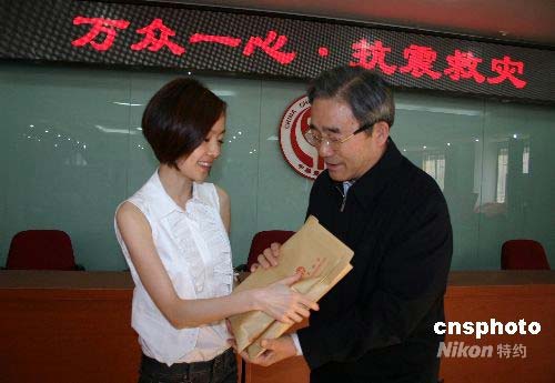 圖:陳魯豫向四川汶川地震災(zāi)區(qū)獻(xiàn)愛心
