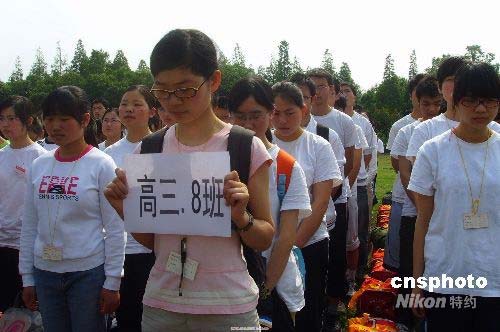 5月19日上午10點,在北川中學高三學生復課儀式上,同學們默哀悼念故者。中新社發(fā) 霍潺 攝