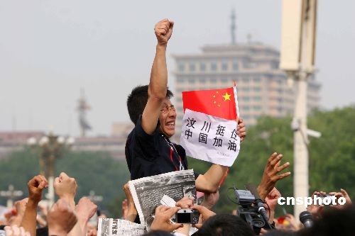 5月19日14時28分,北京天安門廣場上的民眾為四川汶川大地震遇難者默哀3分鐘。一位來自四川的男子高舉右手為災(zāi)區(qū)加油。中新社發(fā) 富田 攝