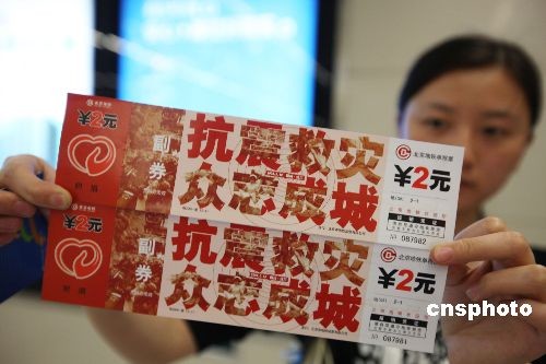5月18日,北京地鐵首次發(fā)行的“特種”愛心附捐車票出現(xiàn)在北京地鐵所有車站售票臺,這套附帶為地震災(zāi)區(qū)捐款獻(xiàn)愛心的文化車票受到了市民的青睞,北京地鐵公司將把附捐的40萬元愛心款全部轉(zhuǎn)交中國紅十字會。這套愛心附捐車票發(fā)行總量為10萬套,每張車票售價(jià)4元,其中包括2元捐給災(zāi)區(qū)的款項(xiàng)。中新社發(fā) 老羅 攝