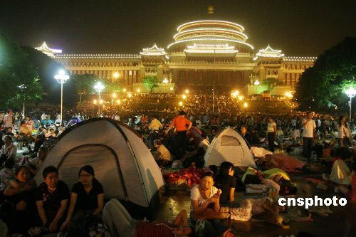 5月20日凌晨,重慶人民廣場內(nèi),大批當(dāng)?shù)厥忻裨诖舜罱◣づ襁^夜。19日晚21時(shí)30分許,重慶市人民政府發(fā)布信息稱,19日至20日,在汶川震區(qū)附近有可能發(fā)生6至7級余震,重慶各地將會有明顯震感。并提醒廣大市民注意安全,按防震知識做好防范工作,注意相互幫助、維護(hù)公共秩序。信息發(fā)布后,大批當(dāng)?shù)厥忻耖_始聚集廣場、平地等開闊地帶過夜。中新社發(fā) 郭晉嘉 攝