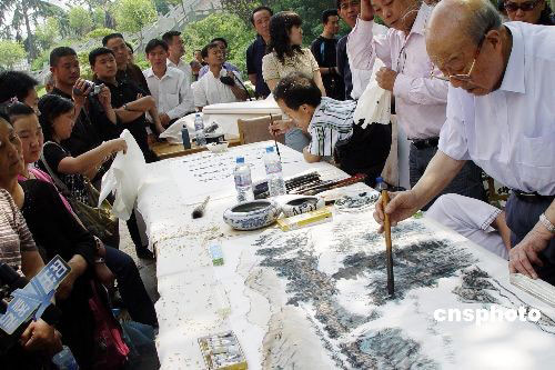 五月二十日,書畫家在鄭州紫荊山公園作畫賑災(zāi)。當(dāng)日,由河南省慈善總會、省文化廳主辦,河南省嵩陽書畫院承辦的“翰墨丹青獻(xiàn)愛心”大型賑災(zāi)書畫義賣活動在此舉行,所得善款將全部轉(zhuǎn)至四川地震災(zāi)區(qū)。 中新社發(fā) 李志全 攝