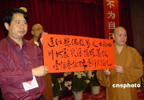 五月二十日上午,由福建省連江縣佛教協(xié)會主辦的“向四川地震災(zāi)區(qū)捐款的愛心募捐活動”,在連江縣城舉行,三千余名連江縣佛教四眾弟子踴躍捐款獻(xiàn)愛心,共募集捐款一百三十多萬元人民幣。圖為連江縣佛教協(xié)會會長界渡法師,將一百三十多萬元善款轉(zhuǎn)交連江縣紅十字會匯往四川災(zāi)區(qū)。