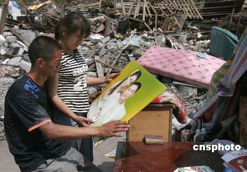 5月19日,四川省什邡市鎣華鎮(zhèn)仁和村三組梁正彬一家正在從廢墟中扒尋自家物品。他們很幸運,災難發(fā)生時,包括老父母和年幼女兒在內的全家5口人都跑出了轟然倒塌的房屋!捌桨簿褪歉!”他們默默收拾殘屋,準備重建家園。中新社發(fā) 張曉理 攝