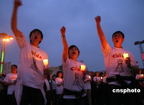 5月20日,當(dāng)日全國哀悼日進(jìn)入第二天,沈陽市民高呼“汶川加油,四川雄起,中國加油”等口號(hào)哀悼四川汶川地震遇難同胞。