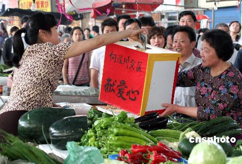 5月21日,浙江省德清縣個私協(xié)會乾元分會和乾元市場開發(fā)服務(wù)所工作人員協(xié)同市場各行業(yè)的經(jīng)營組長,發(fā)起向地震災(zāi)區(qū)人民獻愛心活動,得到市場內(nèi)近300名經(jīng)營戶的積極支持和參與,現(xiàn)場共收到愛心捐款一萬六千余元。四川的災(zāi)情牽動著浙江省德清縣長橋農(nóng)貿(mào)市場廣大經(jīng)營戶的心,截至發(fā)稿時止,廣大經(jīng)營戶捐款活動還在繼續(xù)。