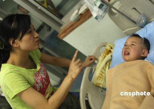 5月21日,在四川汶川5·12大地震中被救出后向解放軍“行隊禮”的北川3歲男孩郎錚在綿陽市解放軍某醫(yī)院成功完成斷臂續(xù)接手術(shù),精神面貌很好。圖為郎錚與媽媽吳曉紅進(jìn)行語言交流。中新社發(fā) 趙振清 攝