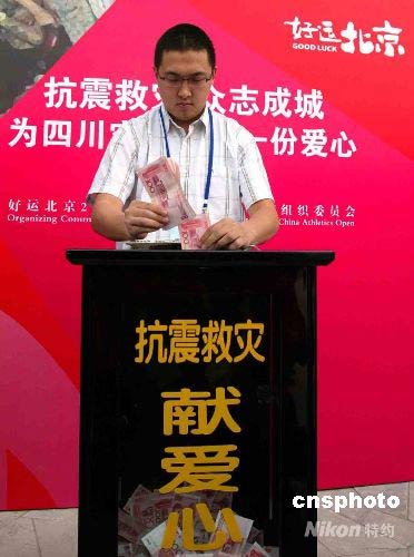 5月22日,“好運(yùn)北京”2008中國(guó)田徑公開賽在國(guó)家體育場(chǎng)“鳥巢”拉開帷幕。這是中國(guó)在全國(guó)哀悼日結(jié)束后舉辦的首項(xiàng)重大賽事,也是鳥巢首次全面開放。圖為國(guó)家體育場(chǎng)工作人員,將此次比賽現(xiàn)場(chǎng)售票所得部分票款五萬(wàn)多元人民幣捐獻(xiàn)四川地震災(zāi)區(qū)。中新社發(fā) 富田 攝