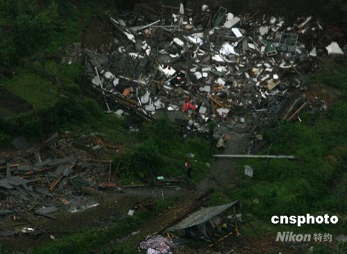 五月二十一日,汶川大地震第十天,從空中可見一位偏遠山村的幸存者回到地震倒塌的家園,面對廢墟。中新社發(fā) 賈國榮 攝