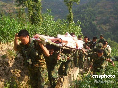 四川震區(qū)某摩步師黨員突擊隊(duì)跋山涉水轉(zhuǎn)移傷員