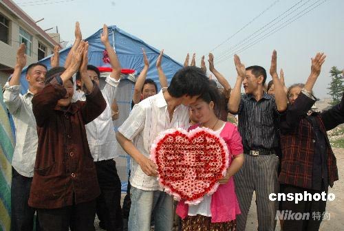 5月22日,在汶川大地震重災(zāi)區(qū)——四川安縣黃土鎮(zhèn)馬村境內(nèi)的臨時(shí)災(zāi)民救助點(diǎn)里,新郎肖建平與新娘熊招鄰舉行了帳篷婚禮。災(zāi)難會(huì)帶給人們創(chuàng)傷,但是無(wú)法磨滅人們對(duì)美好生活的向往。中新社發(fā) 涂萍 攝