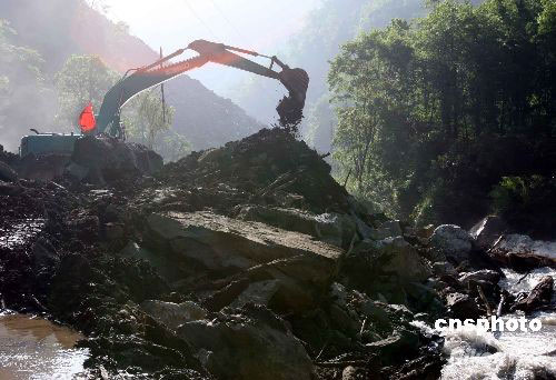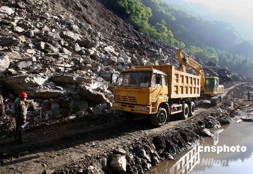 5月24日,從重慶趕來的武警交通直屬工程部的部隊(duì)在燒湯河畔搶修從四川省小金縣至汶川縣映秀鎮(zhèn)的303省際公路。5·12大地震造成比鄰震中映秀鎮(zhèn)的臥龍與世隔絕,嚴(yán)重的塌方積石形成多個(gè)堰塞湖威脅這里的民眾與中國(guó)大熊貓科研中心的安危。中新社發(fā) 任晨鳴 攝