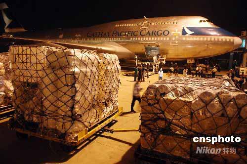 滿載各類救災(zāi)物資、從美國起飛的一架波音七四七貨運專機,于24日晚11時50分飛抵成都雙流國際機場。這架由美國著名慈善機構(gòu)撒瑪利亞救援會包租的專機,是截至目前政府渠道之外運送救災(zāi)物資到四川災(zāi)區(qū)的首架國外民間包機。中新社發(fā) 陳文 攝