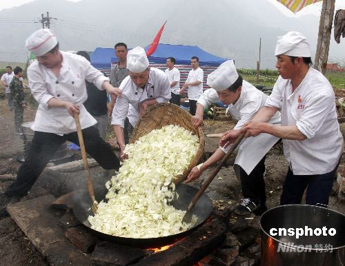 2008年5月25日下午6時,四川彭州市小魚洞鎮(zhèn)大南村田地上,來自北京的大廚們在為當?shù)卮迕褡觥百c災飯”。24日開始,北京美食聯(lián)盟組織北京全聚德、大鴨梨、便宜坊等大飯店的105名廚師,籌集200萬元資金在災區(qū)分設(shè)3個賑災點,免費為災區(qū)群眾供應飯菜。中新社發(fā) 張曉理 攝