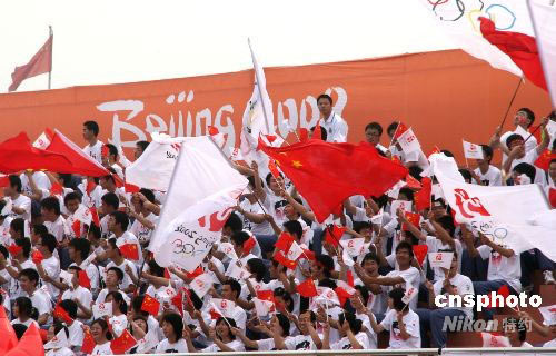 圖:江蘇泰州民眾為奧運(yùn)圣火傳遞歡呼