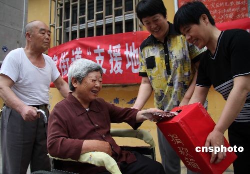 5月27日,退休老人張世俊(左一)推著老伴來到捐款站,把節(jié)儉下來的5000元錢投進捐款箱。這是老夫妻倆第三次為地震災(zāi)區(qū)捐款獻愛心。汶川大地震發(fā)生后,張世俊、李愛玲夫婦先后三次把省吃儉用的2萬元錢捐給地震災(zāi)區(qū),在當(dāng)?shù)乇粋鳛榧言。中新社發(fā) 吉 喆 攝