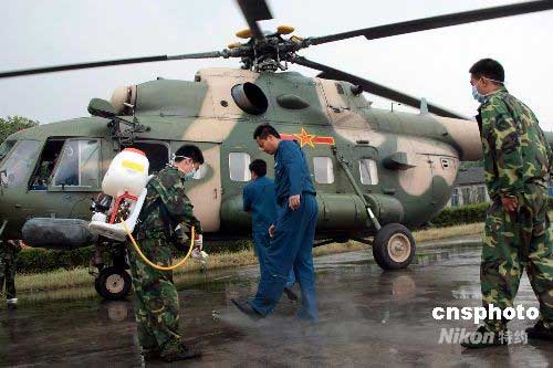 圖:震區(qū)中國空軍為飛行員和飛機(jī)消毒
