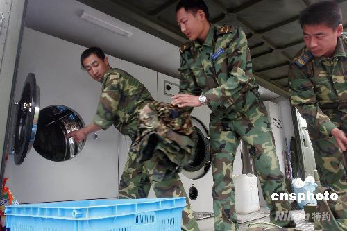 5月29日,工作人員在四川什邡市紅白鎮(zhèn)路邊的一輛流動(dòng)洗衣車上忙碌。近日,成都軍區(qū)聯(lián)勤部在各重災(zāi)區(qū)設(shè)置流動(dòng)洗衣車為救援官兵和受災(zāi)群眾免費(fèi)服務(wù),目前已經(jīng)有5臺野戰(zhàn)流動(dòng)洗衣車在重災(zāi)區(qū)投入使用。據(jù)介紹,每輛野戰(zhàn)流動(dòng)洗衣車每90分鐘可以洗滌、烘干約40公斤衣物。中新社發(fā) 張曉理 攝