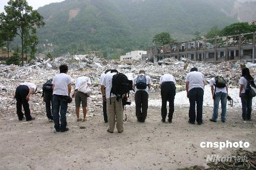 《中國新聞周刊》參與一線抗震救災報道的編輯記者,重返他們采訪過的北川中學,在廢墟前鞠躬向亡者默哀。中新社發(fā) 黃永莉 攝