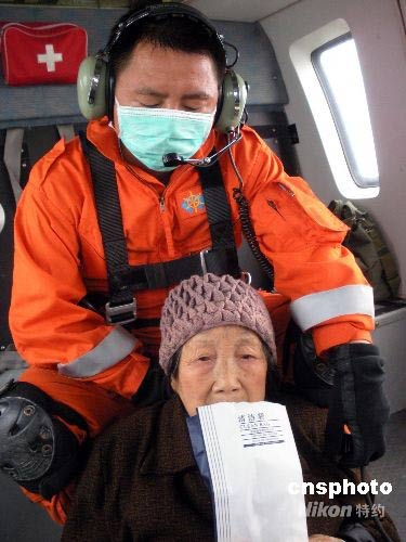5月31日,90歲老奶奶被民航直升機(jī)南航珠海S76型7307號(hào)飛機(jī)成功救出。家住綿竹市清平天池南木溝的老人,地震前獨(dú)居深山。5.12汶川地震發(fā)生時(shí),老人在室外乘涼,腰部被山石擊傷。因出山和進(jìn)山路中斷與外界隔絕聯(lián)系,一直被困深山中。19天來靠吃野菜維持生命。民航直升機(jī)抗震救災(zāi)基地接到綿竹搜救部隊(duì)的消息后,當(dāng)即派出兩個(gè)機(jī)長(zhǎng)劉洋、段俊德執(zhí)行飛行任務(wù),交通部南海第一飛行隊(duì)救生員李春林、絞車手宋樂平一同前往。由于地形復(fù)雜,山式狹隘,峽谷電線縱橫交錯(cuò),沒有可著地條件,搜救人員只好實(shí)施空中救援。上午10時(shí)40分成功將老人救出。中新社發(fā) 張鈺昱 攝