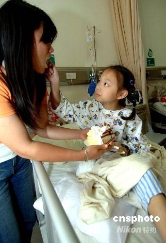 六月一日,福建省立醫(yī)院愛心病房,經(jīng)過兩次截肢的四川地震災(zāi)區(qū)受傷小女孩楊芹正在給媽媽喂蛋糕。在“5.12”汶川大地震中,楊芹的右腿被水泥板壓了近20個小時,右大腿以下部分嚴(yán)重骨折、感染,神經(jīng)、肌肉等組織大量壞死,在一周之內(nèi)做了兩次截肢手術(shù),失去整條右腿。她后來被轉(zhuǎn)到福建省立醫(yī)院愛心病房接受治療。中新社發(fā) 王東明 攝