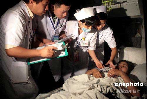 六月一日晚十一時許,四十位四川地震傷員轉(zhuǎn)移抵達福建泉州,分乘救護車前往泉州四家醫(yī)院接受救治。在救護車上,交接醫(yī)生第一時間了解病人情況并做出移動方案。中新社發(fā) 傅丹丹 攝