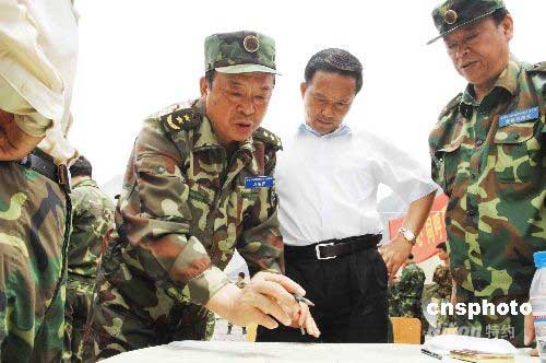 成都軍區(qū)司令員李世明中將6月2日在災(zāi)區(qū)映秀組織指揮軍地人員搜尋失事直升機。中新社發(fā) 陳文 攝