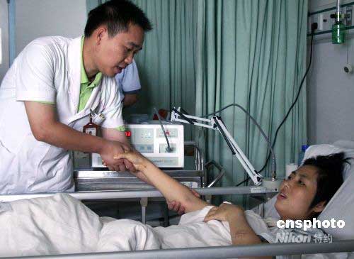 6月2日,廣西醫(yī)科大學(xué)第一附屬醫(yī)院康復(fù)技師龍耀斌在給傷員郭昌碧做術(shù)后康復(fù)訓(xùn)練。據(jù)了解,該醫(yī)院對第一期55例四川地震傷員實施手術(shù)已全部完成,目前治療的重點(diǎn)開始向康復(fù)轉(zhuǎn)移,主要包括心理康復(fù)和肌體功能的康復(fù),已有心理醫(yī)生和理療師開始介入到康復(fù)治療當(dāng)中。中新社發(fā) 林艷華 攝