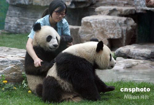 6月2日,一對雌雄“奧運大熊貓寶寶”在北京動物園新家依偎在一直照料它們的臥龍女飼養(yǎng)員身邊玩耍。5月24日從四川地震災區(qū)運抵北京的八只臥龍“奧運大熊貓寶寶”,經(jīng)過多日的精心照料已基本從大地震的陰影中解脫出來。從6月5日開始,公眾可以在這里盡情觀賞它們的風采。 中新社發(fā) 任晨鳴 攝