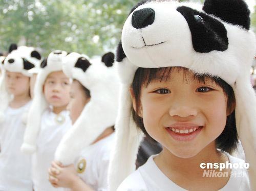 6月5日上午,8只四川臥龍大熊貓首次與游客在北京動物園見面。圖為參加首日見面活動的北京小朋友頭戴可愛熊貓頭套。中新社發(fā) 魏瑋 攝