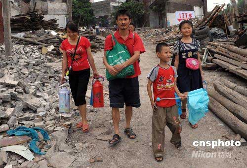 6月14日,重慶萬州城區(qū)三峽工程4期移民搬遷區(qū)域,拆遷工作正常進行,一家4口人走在177米水位線下的拆遷區(qū)域中。6月15日,奧運火炬將來到三峽庫區(qū)重慶萬州傳遞。中新社發(fā) 廖攀 攝