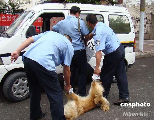 2008年6月16日中午,一條瘋狗闖進(jìn)河南省武陟縣城和平路縣直幼兒園附近并在圍墻邊游蕩,見人就咬,連續(xù)咬傷5名過往行人。此時已接近放學(xué)高峰,一旦咬傷學(xué)生后果不堪設(shè)想。武陟縣110接到群眾報警后,立即出動4名警力攜帶微沖等捕殺工具趕至現(xiàn)場,經(jīng)過20多分鐘追擊堵截,警察最終將瘋狗逼到一小胡同內(nèi),一名警察僅開一槍就將瘋狗打死。目前,被瘋狗咬傷的人員仍在醫(yī)院搶救。中新社發(fā) 雒根生 攝