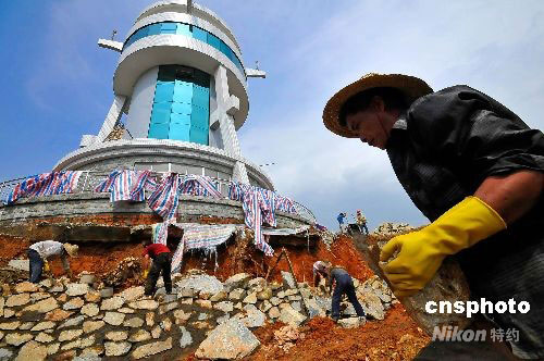 6月17日,廣西梧州工人在雷達塔地基處搶修承重擋土墻。連日的大雨,使得位于梧州榜山頂上梧州氣象局新建的雷達塔地基發(fā)生小型坍塌,塔體地面出現(xiàn)裂紋。中新社發(fā) 何鎏 攝